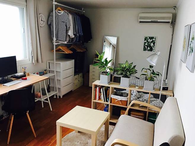 행거 : 이케아 MULIG / 소파테이블 : 이케아 LACK / 서랍장 : 이케아 HELMER