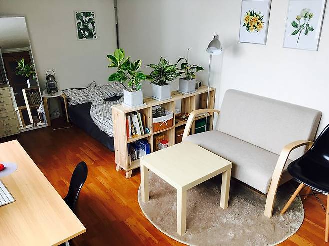 사진에는 지금은 하늘나라로 떠나버린 스파티필름이 보이네요..(애도) 오래전부터 가져온 분리된 침실의 구현을 책장을 통해 이뤄냈습니다. 식물을 키우기 시작하면서 그린 인테리어! 를 외치며 벽에도 꽃과 식물 액자를 달아 두었네요.