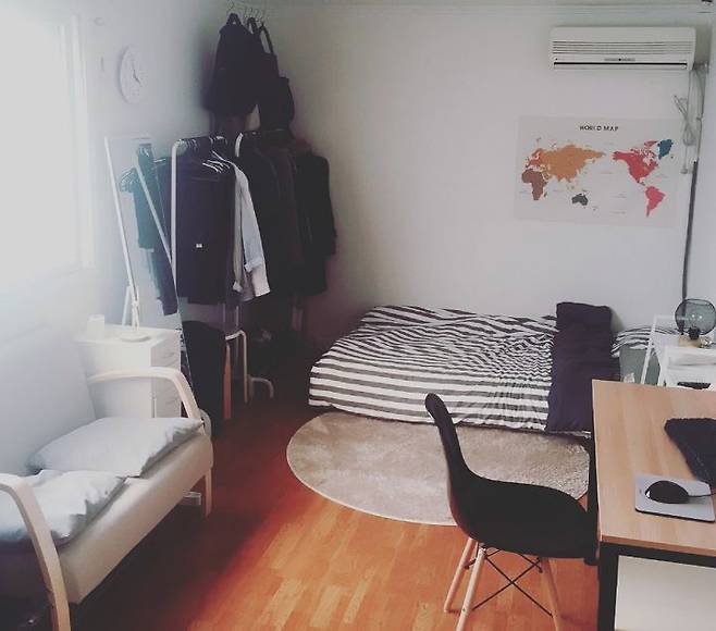침대 헤드부분 벽면에는 세계지도를 걸어두어 휑한 느낌을 없애 보았습니다. 항공사에 다니는 터라 방에 지도 하나쯤은 걸어둬야 하지 않느냐 하는 강박감에 세계지도를 선택했답니다.