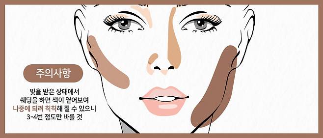 쉐딩만 하면 화장이 진해 지거나 오히려 칙칙해 보이는 분들이 있는데요. 그 이유는, 화장할 때 고개를 들거나 빛을 받은 상태에서 화장하면 쉐딩이 옅게 보이기 때문이에요. 쉐딩을 해도 크게 티가 안 나니까 진하게 하게 되는 것이죠. 뭐든 과하면 금물! 부족하다 생각될지라도 꼭 3~4번 정도만 쓸어주세요.
