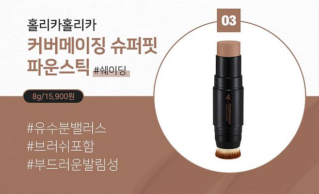 홀리카홀리카 슈퍼핏 파운스틱은 총 4종류가 있는데요. 3컬러는 20호, 21호, 23호 파운데이션 스틱, 4호는 쉐이딩 컬러입니다. 에코서트 인증 성분인 해바라기씨, 스위트 아몬드 오일, 달맞이꽃 오일이 들어가 있어서 촉촉하게 사용이 가능하면서 피부 유·수분 밸런스에 도움을 주죠. 한쪽에는 브러시가 있어 위생적이고, 빠른 메이크업 완성이 가능해요. 발림성도 매우 부드럽기 때문에 피부 자극 없이 자연스러운 컨투어링이 가능하답니다.