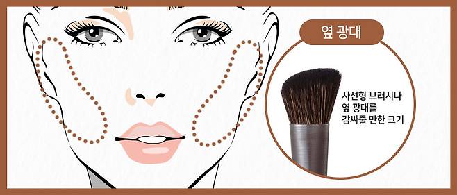 옆 광대에 쉐딩을 할 때는 사선형 브러시나 옆 광대를 감싸줄 만큼의 크기가 좋아요. 쉐딩 제품을 충분히 묻혀준 후에 관자놀이를 기준으로 앞쪽으로 왔다가 다시 뒤쪽으로 가줍니다. 3~4번 정도 진행해주세요. 관자놀이를 기준으로 하지 않을 경우 움푹 들어간 것처럼 화장이 될 수 있으니 조심!
