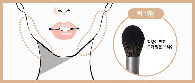 직경이 크고 모가 많은 브러시가 좋아요! 작은 브러시일수록 경계가 잘 생기기 때문이죠. 귀를 기준으로 쉐딩을 하면 쉬운데요. 턱 밑에서 귀까지 쓸어 올려줍니다. 여기서 그대로 내려가는 것보다는 귀를 스치듯이 내려가는 게 좋아요. 턱은 부위가 좁아 음영을 준 게 눈에 잘 띌 수 있는데요. 그렇기 때문에 턱 윗부분보다는 턱과 목이 이어지는 경계에서 쉐딩을 시작하면 더 자연스럽게 음영을 줄 수 있어요.