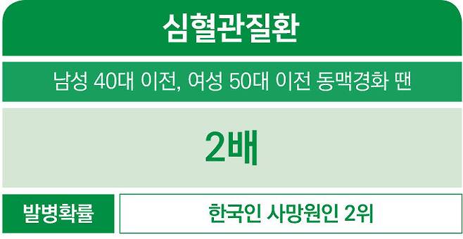 한국인 사망원인 2위를 차지하는 심혈관질환도 가족력의 영향을 받는다. 캐나다 맥매스터 의대 연구결과에 따르면 부모가 심장마비를 경험한 사람은 그렇지 않은 사람보다 심장마비를 겪을 확률이 1.5배 높은 것으로 나타났다. 또한 남성이 40대 이전, 여성이 50대 이전에 동맥경화가 생기면 자녀에게도 나타날 위험이 2배 높아진다는 연구결과도 있다. 심혈관질환은 심장마비, 협심증 등 위중한 질환이 나타나기까지 발견하기 어려워 정기적인 검사를 받는 게 중요하다.