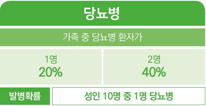 당뇨병은 전 세계적으로 가장 흔하며, 그 유병률이 급격하게 증가하고 있는 만성질환이다. 질병관리본부 국민건강영양조사 결과보고서에 따르면 한국인 30세 이상의 당뇨병 유병률은 2001년 남자 9.5%, 여자 7.9%에서 2013년 남자 12.8%, 여자 9.1%로 꾸준하게 증가하고 있다. 당뇨병도 가족 영향을 받는다. 부모가 당뇨병을 앓았거나 앓고 있다면 본인이 당뇨병에 걸릴 확률은 30~40% 이상으로 높아진다. 부모 중 한쪽만 앓아도 확률은 15~20% 정도 높다. 특히 당뇨병 가족력이 있으면 임신성 당뇨병의 발생은 170%까지 높아진다는 연구결과가 있는 만큼 임신을 준비하고 있다면 더욱 신경 써야 한다.