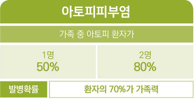 아토피피부염 환자의 70% 정도는 가족력이 있다. 부모 모두 아토피피부염이 있으면 자녀의 80%, 부모 중 한 명일 경우 40~60%의 확률로 자녀에게서 아토피피부염이 나타난다. 국내의 여러 연구 결과에 따르면, 어머니가 아토피피부염을 앓았을 때 자녀의 발병률이 아버지가 앓은 경우보다 높다. 아토피 피부염이 대물림 되는 경우를 막기 위해서는 아토피피부염 가족력을 가진 사람이 아기를 낳으면, 6개월 이상 모유 수유를 하도록 권장하고 있다. 모유에 포함된 다양한 면역 성분이 아기가 균형 잡힌 면역력을 갖도록 해줘 아토피피부염 억제에 도움을 주기 때문이다. 모유 먹일 여건이 안 되면 가수분해 단백질 함유 분유를 먹이는 게 좋다.