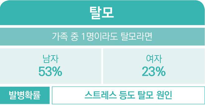 탈모 환자들의 가족력을 조사한 결과 남성의 경우 53% 여성의 23%가 탈모를 경험한 것으로 나타났다. 하지만 탈모는 유전적인 원인을 제외하고도 스트레스 자가면역질환 등 여러 가지 원인으로 발생한다. 출산, 특정 약물 복용, 다이어트, 갑상선 질환, 빈혈 등으로 인해 탈모증이 나타날 수 있다. 특히 갈수록 심각해지는 미세먼지가 두피의 모공을 막아 탈모를 유발할 수 있다는 지적도 나온다. 미세먼지 속 중금속이 모발 주기를 변화시키고 모낭 세포를 파괴시켜 머리카락을 생성하는 모낭세포의 활동을 저해할 수 있다는 것이다.
