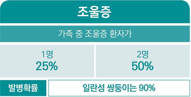 조울증은 부모 중 한 명이 조울증이면 25%(양친 모두는 50%), 형제 17%, 일란성 쌍둥이는 50~90%까지 가족력을 보인다. 조울증 외에 신경성대식증, 공황장애, 알코올중독, 우울증 등도 가족력의 영향을 받는다. 뇌에서 도파민 분비량이 과도해지면 조증이 발생하고, 체내에 세로토닌이 감소하면 울증이 나타나는데 세로토닌은 100% 탄수화물 등 음식물을 통해 외부에서 공급된다. 그러므로 조울증 가족력이 있는 사람은 균형 있는 식사를 충분히 해야 한다. 도파민 과다 분비는 일반인이 스스로 해결하기 어려우므로 증상이 나타나는지 평소 관찰하는 것이 중요하다.