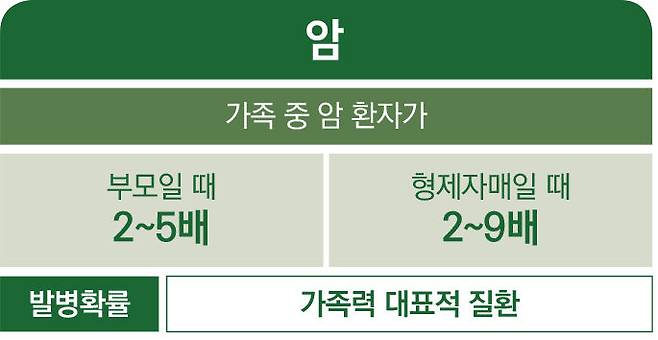 보건복지부가 발표한 암 발생통계에 따르면 2015년 기준 우리나라 국민 31명 중 1명은 암유병자인 것으로 나타났다. 이는 사망원인 1위인 암이 우리나라 국민들에게는 흔하게 발생하고 있다는 뜻이다. 특히 암은 가족력의 영향을 크게 받는 대표적인 질환으로, 대장암·유방암·난소암·갑상선암·위암·폐암·간암·췌장암·전립선암 등에서 가족력이 비교적 뚜렷하다. 국제 암학회지에 따르면 부모가 암일 경우 자녀가 암에 걸릴 확률은 일반인에 비해 2~5배 정도 높았으며, 형제자매가 암일 경우 같은 암에 걸릴 확률이 2~9배까지 높아지는 것으로 밝혀졌다.