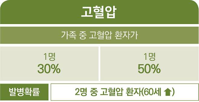 고혈압은 부모보다 형제자매간의 가족력이 강한 영향력을 미친다. 질병관리본부 국민건강영양조사 자료에 의하면 부모 모두 정상일 때 자녀가 고혈압일 확률은 4%에 불과하지만, 부모 모두 고혈압인 경우 29.3%가 고혈압 진단을 받는다. 하지만 형제자매가 고혈압이면 57%가 고혈압이다. 고혈압은 대부분 정확한 이유를 알 수 없기 때문에 가족력이 있다고 해도 발병을 의학적으로 막기는 어렵다. 그러나 규칙적인 운동과 나트륨 과다 섭취를 줄이는 습관은 가족력으로 인한 고혈압 발병 확률을 낮출 수 있다. 또한 30대부터는 최소 1년에 한 번씩 혈압을 재서 혈압 상승을 초기에 파악해야 한다.