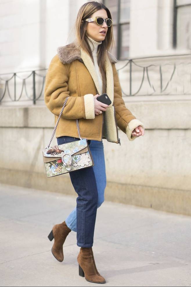 11. 양털이 안에 있는 가죽 코트와 블랙 부티와 매치하기