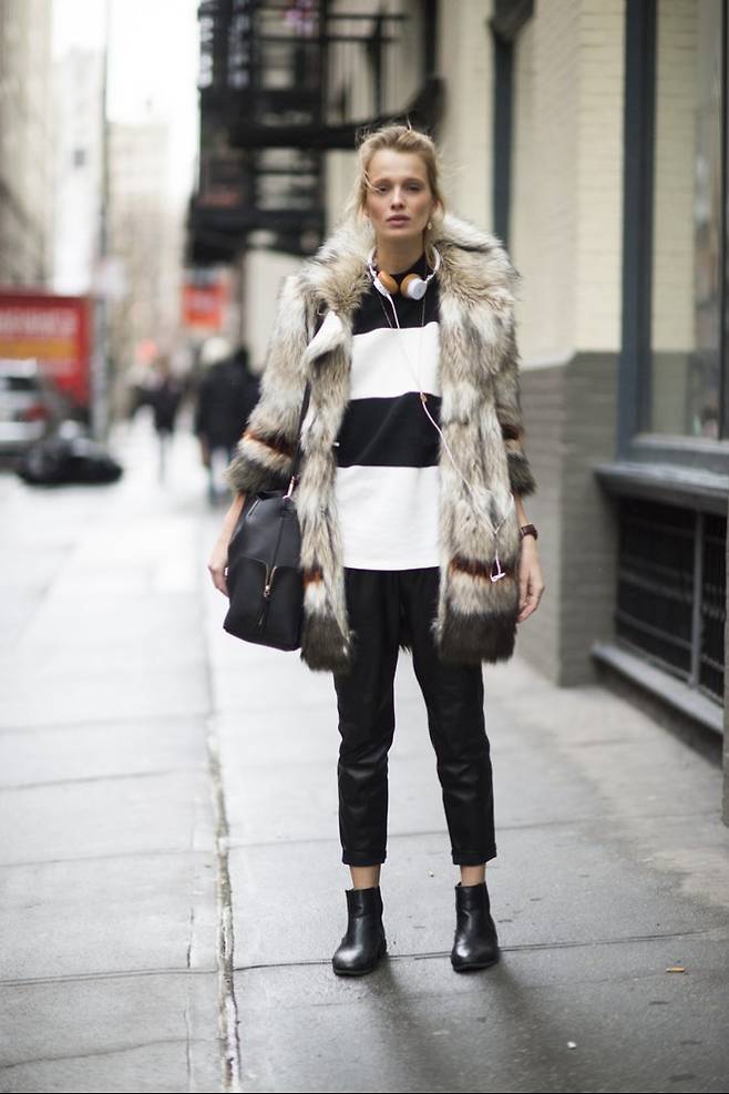 23. 모피 코트와 스트라이프 스웨터, 블랙 부티와 매치하기