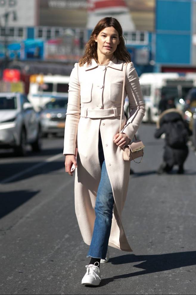 20. 크림 재킷과 블랙 스타킹, 화이트 스니커즈와 매치하기