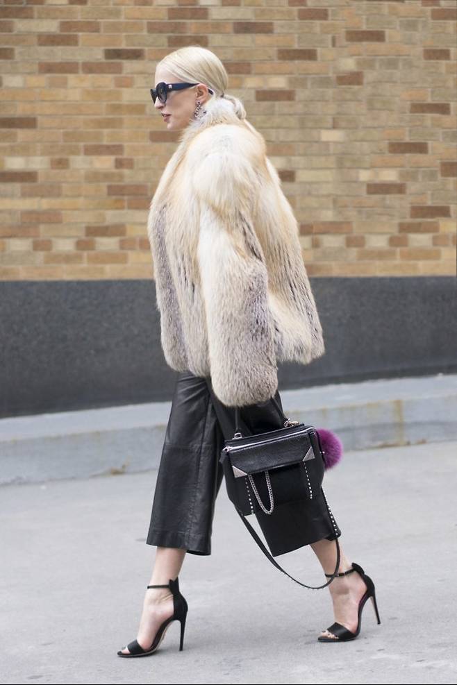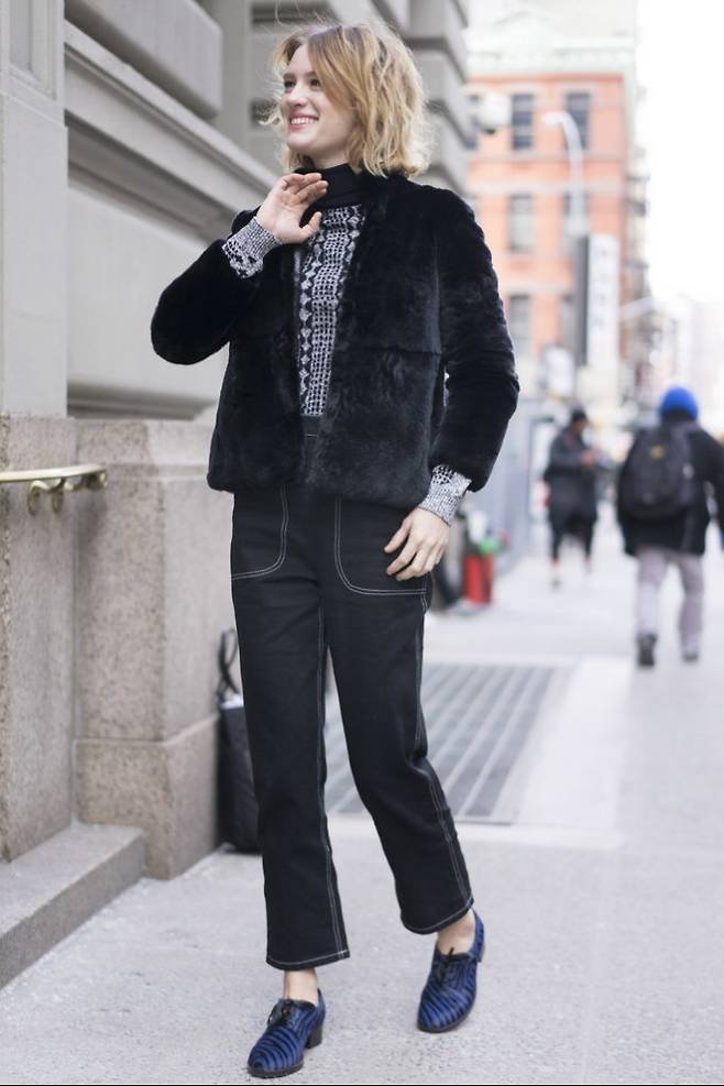6. 블랙 퍼 재킷과 옥스포드 슈즈와 매치하기