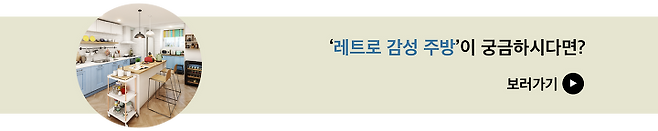 뉴트로 컨셉의 인테리어는 올해 각광을 받기도 했죠. 만약 2인 이하의 가구라면 식탁이나, 아일랜드 테이블을 일자로 배치하는 것을 추천드려요:) 좁은 공간을 효율적으로 사용할 수 있기 때문입니다.