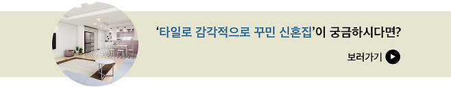 만약 5인 이상의 가족이라면 타일을 이용해서 주방과 거실 공간을 분리할 수도 있습니다. 가벽이나 파티션을 설치하지 않고도 화려한 패턴 타일로 간단하게 주방과 거실의 공간을 명확하게 분리하는 방법입니다!