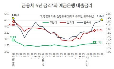 현재 금융채 5년물 금리인 1.844%를 기준으로 감안하면, 신용대출 금리는 4%대까지 오를 수 있다. 5년만기 금융채 금리가 1.882% 이던 2019년 5월 은행권 신용대출 금리는 4.4%에 달했다.