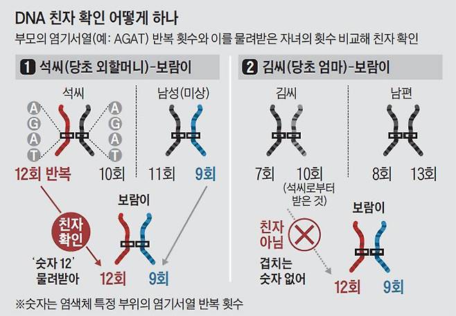 보람양이 석씨의 딸이라는 것도 DNA 검사에서 이 염기 조합의 반복된 횟수를 대조해서 확인한 것이다. 예컨대 보람양의 7번 염색체쌍에서 한쪽은 ‘AGAT’가 9번 반복되고, 다른 한 쪽은 12번 반복돼 나타났다고 하자. 둘 중 하나는 어머니에게서 물려받은 것이기 때문에, 어머니의 7번 염색체쌍 중 어느 한 부분에선 반드시 ‘AGAT’ 염기 조합이 9번 또는 12번 반복되는 모습이 나타나야 한다. 만약 없다면 친자가 아니다. 그런데 당초 보람양의 엄마로 알고 있었던 석씨의 딸 김모(22)씨 DNA를 검사해보니 7번 염색체쌍 해당 부분에서 ‘AGAT’ 염기 조합이 9번 반복되는 것도 없었고, 12번 반복되는 것도 없었다. 그래서 경찰은 당초 외할머니로 알려졌던 석씨의 DNA까지 확보해 추가로 국과수에 제출했는데, 석씨의 해당 염색체쌍 부분에선 9번이나 12번 반복되는 것이 있었던 것이다.