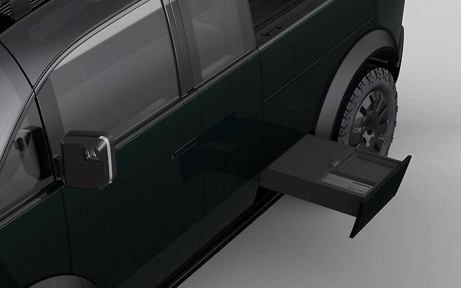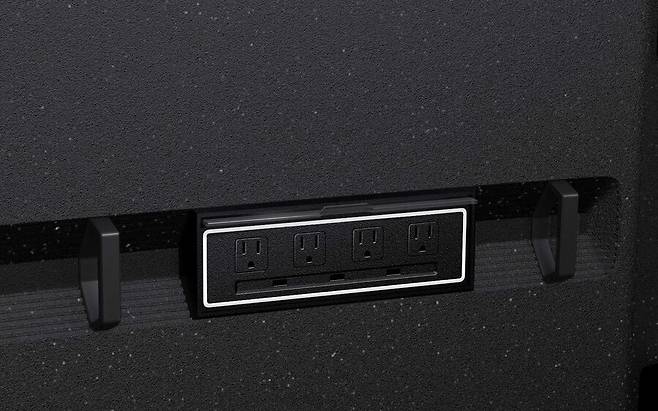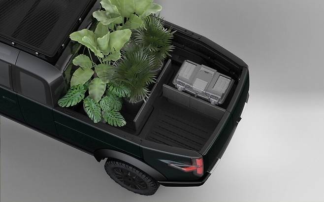 앞머리에 엔진이 없다는 특징도 활용했다. 테슬라 모델 3처럼 프렁크(Front+Trunk)가 있는데, 커버를 내리면 작업용 선반이 된다. 다양한 전동 공구를 연결할 110V 콘센트까지 넣었다. 적재함 양 옆 패널도 2단으로 펼칠 수 있고, 그 아래로 적재함에 쉽게 드나들기 위한 발판을 마련했다. 발판은 구급상자나 노트북을 넣는 수납 공간 역할도 함께한다. 또한, 별도의 지붕을 씌우면 캠핑카로 변신하기도 한다.