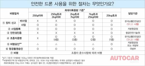 이번호에서는 먼저 기체신고에 대해 알아보자. 드론을 구매했다면 우선 기체신고부터 해야 한다. 과거에는 자체중량 12kg을 초과하는 기체에 한해서만 신고하면 되었다. 그러나 올해 1월 1일부터는 최대이륙 중량이 2kg을 초과하는 비행장치 또는 모든 사업용 비행장치는 모두 신고를 해야 한다.(다만, 비사업용 중 계류식 무인비행장치, 연구기관의 시험·조사·연구개발용 기체, 비행에 사용되지 않는 기체, 군사목적용 기체 등은 신고대상에서 제외한다.)