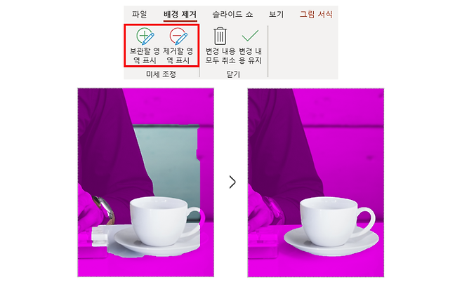 한 번에 배경 제거가 안된다면 [미세 조정]섹션의 [보관할 영역 표시], [제거할 영역(보라색 부분)표시]를 활용하여 보정해주면 됩니다.