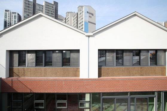 우선 학교를 잘게 나눴다. 신길중은 삼각 지붕의 건물 하나가 교실, 한 학급이다. 옛적 아이들에게 집을 그리라면 이렇게 그렸을 법한 모양새다. 아이들이 등교할 때 집에 간다는 느낌이 들게끔 작정하고 이렇게 디자인했다.