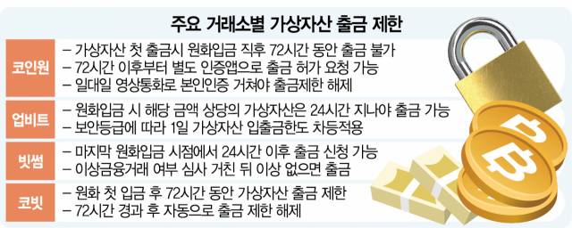 10일 관련 업계에 따르면 국내 4대 가상자산 거래소로 꼽히는 업비트·빗썸·코인원·코빗은 모두 보이스피싱과 금융사고 등을 예방하기 위해 이용자가 원화를 입금한 직후에는 가상자산으로 출금할 수 없도록 제한하고 있다. 추적이 어려운 가상자산의 특성을 악용해 비트코인으로 보이스피싱을 시도하거나 사기범이 실명 계좌를 보유한 거래소 이용자에게 접근해 범죄에 이용된 자금을 가상자산으로 세탁하려는 등의 금융 사기가 꾸준히 발생하고 있어서다. 이 때문에 업비트와 빗썸은 원화를 최초 입금한 시점으로부터 24시간 동안, 코인원과 코빗은 72시간 동안 이용자가 가상자산을 출금할 수 없도록 하고 있다.