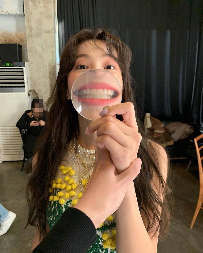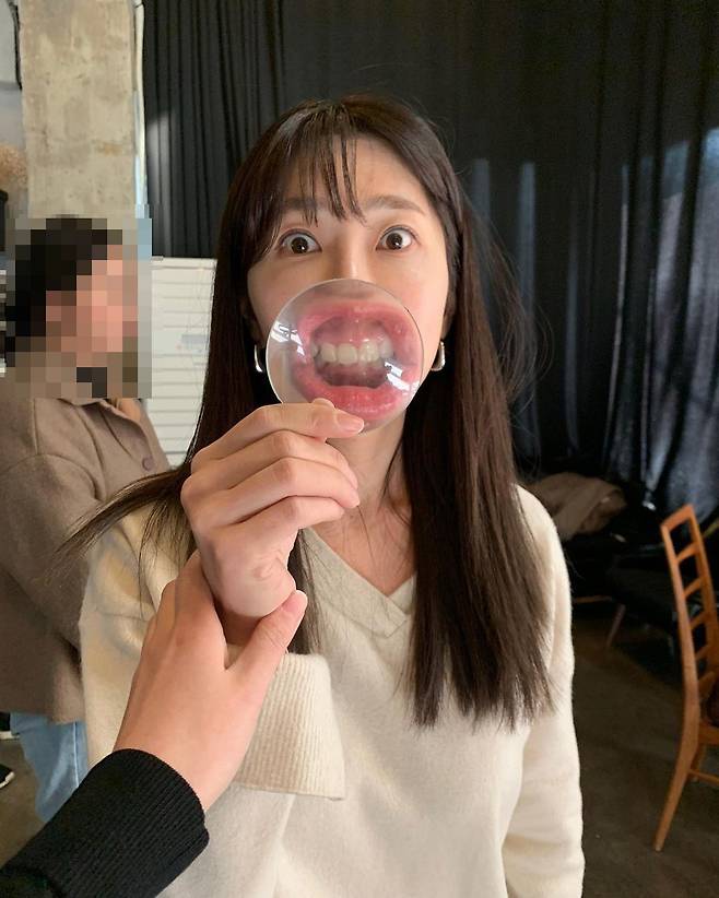 공개된 사진 속에는 돋보기를 이용해 자신의 입을 클로즈업해서 찍고 있는 정혜성의 사진이 담겼다.
