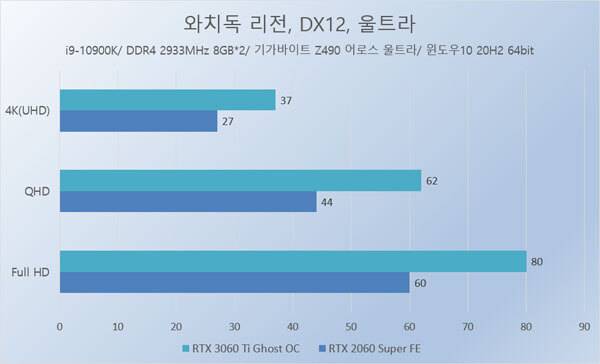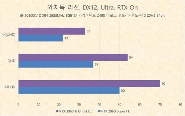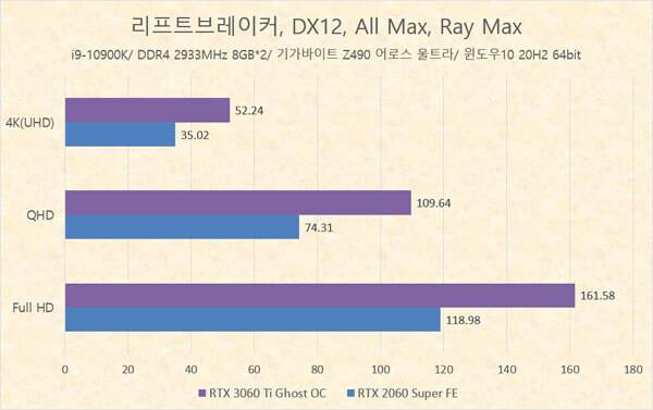 결과가 말해주지만, 전 세대 동급 라인업 제품인 RTX 2060 Super와 비교해 게인워드 지포스 RTX 3060 Ti Ghost OC는 최대 50% 가까이 높은 성능을 내준다. 특히 레이트레이싱을 적용했을 때 동일 해상도에서 더 높은 성능 차이를 보이므로, 레이 트레이싱이 적용된 최신 게임을 즐기는데 더욱 유리하다.