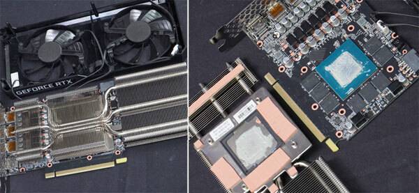 써멀 블록은 GPU와 VRAM, 전원부 DrMOS 일체형 디자인이며, 세 개의 히트파이프는 GPU의 발열을 중점적으로 주변 방열판으로 전달하도록 배치된 것이 한 눈에 들어온다.