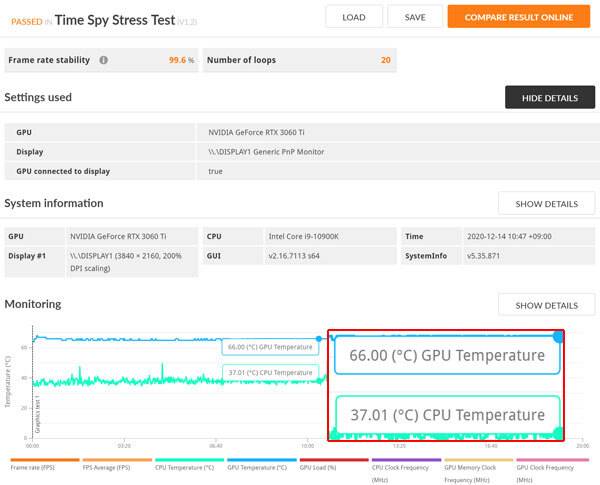 게인워드 지포스 RTX 3060 Ti Ghost OC의 쿨링 성능을 알아보기 위해 3DMark Time Spy Stress Test를 구동했다. 초반에 잠깐 온도가 높아지기는 했지만 테스트가 진행되면서 약 66℃ 수준에서 안정화 되었고, 프레임 안정성도 99.6%로 매우 우수한 특성을 보였다.