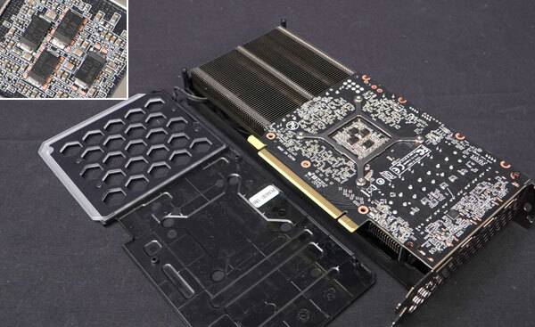 백플레이트는 아쉽게도 금속 재질이 아닌 플라스틱으로 디자인되어 추가적인 방열판 역할은 기대하기 어렵고, 스크린 쿨링을 위해 PCB를 줄인 영향으로, 8핀 보조전원 커넥터는 전체 그래픽 카드 길이 중 약 3/5 지점에 위치해 있다.