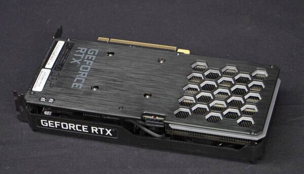 게인워드 지포스 RTX 3060 Ti Ghost OC의 후면에는 제품 보호를 위한 백플레이트가 장착되어 있다. 역시 헤어라인 디자인으로 분위기를 살리고, RTX 30 시리즈 특유의 스크린 쿨링 구조도 확인되며, 측면의 'GEFORCE RTX' 브랜드와 스크린 쿨링 주변부에 'ㄱ' 형상으로 둘러쳐진 흰색 아크릴에는 ARGB LED로 멋을 냈다.