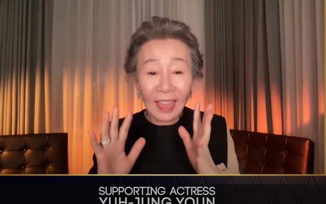 저는 한국의 여배우 윤여정입니다. 어떤 말을 해야 할지 모르겠네요. 후보에 올라 정말 영광입니다. 아, 이제 수상자죠"