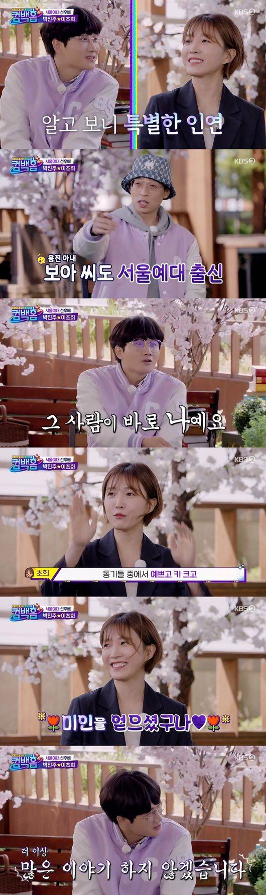 이에 이초희는 "그랬나"라고 말해 웃음을 자아냈다. 박진주는 "나는 서울예대에 선배 누가 있나라고 물어보면 유재석 선배님 이라고 이야기한다"라고 말해 폭소케 했다.
