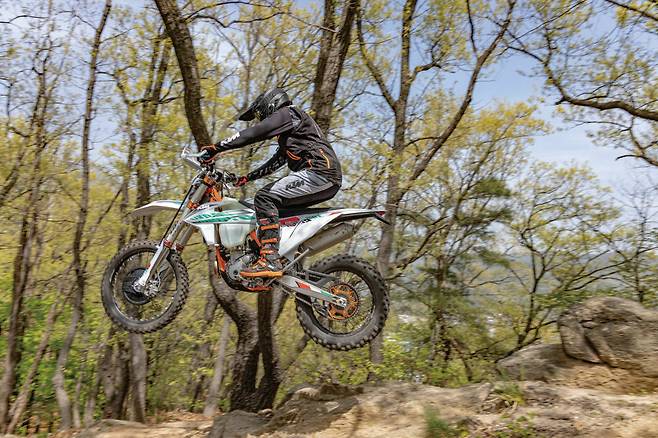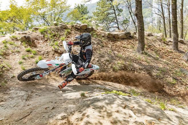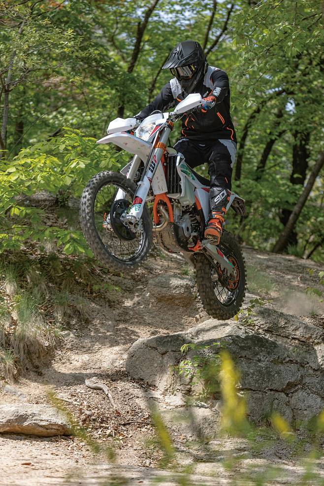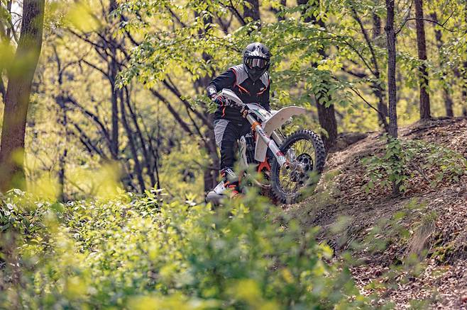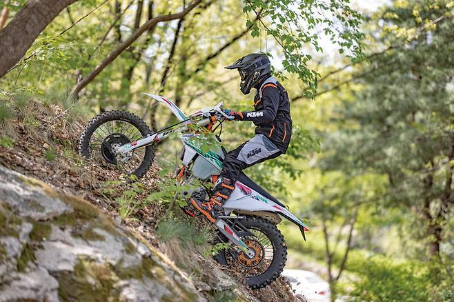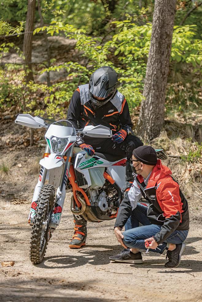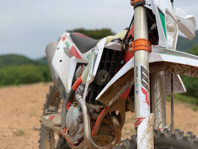 엔듀로 바이크는 극한의 환경을 달린다. 미끄러운 노면은 기본이고 급격한 경사의 업힐이나 다운힐, 바위나 나무 같은 장애물 등을 수시로 주파한다. 이때 라이더의 주행 실력에 따라 코스 주파가 가능하냐와 불가능하냐가 결정된다. 그렇다면 라이더의 실력 다음은 무엇이 중요할까? 바로 서스펜션이다. 노면이 고르지 않은 오프로드에서 충격 흡수 및 회복을 제대로 하지 못하면 타이어의 마찰력을 만들어낼 수 없고 피로도가 상당하기 때문이다. 서스펜션 테스트를 하기 전까지는 순정 서스펜션도 충분하다고 생각했고 마찰력을 높이기 위해 소프트 타이어에만 집중해왔다. 하지만 고성능 서스펜션이 주는 안정감과 고급스러운 움직임, 마찰력 등으로 인해 빠르게 달리기 위한 우선순위로 올라섰다.