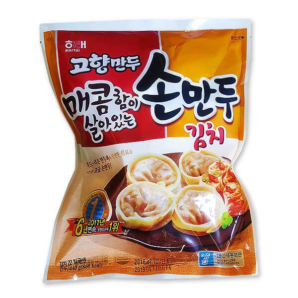 고향만두 손만두는 얇은 피에 김치의 매콤함과 칼칼함이 살아 있는 김치 손만두이다. 물에 삶는 것보다 프라이팬에 구웠을 때 김치 향과 맛이 강해지는 특징이 있으며 쫀쫀한 만두피의 식감이 고기만두 같은 느낌이 난다. 김치 만두임에도 매운맛이 덜해서 매운 것을 잘 못 먹는 사람들에게 추천할 수 있다. 해태에서 나온 제품이다.
