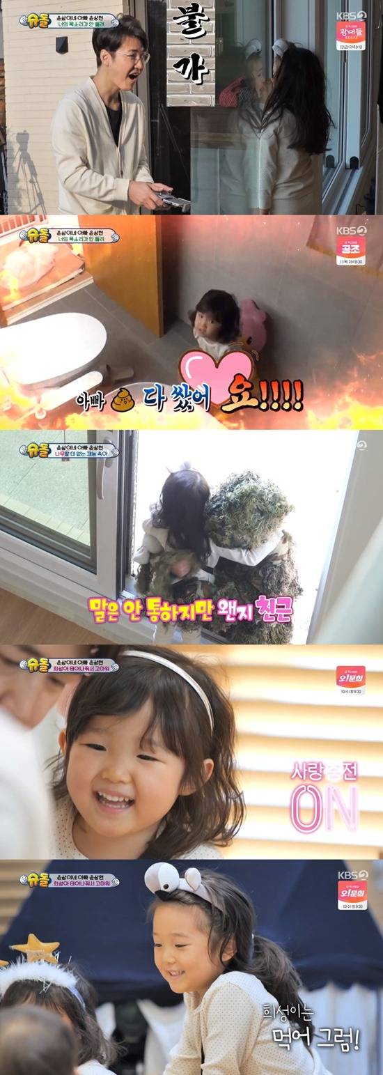 이어 윤상현은 풍선도 아이들 스스로 만들 수 있도록 도왔다. 먼저 풍선을 불겠다고 나겸이의 머리를 잡은 희성이는 생일임에도 홀로 반성의 시간을 갖게 됐다. 나겸이는 그런 희성이를 안타깝게 바라보며 우애를 드러냈다. 희성이도 "아빠 잘못했어요"라며 나겸이를 안아주며 화해했다.