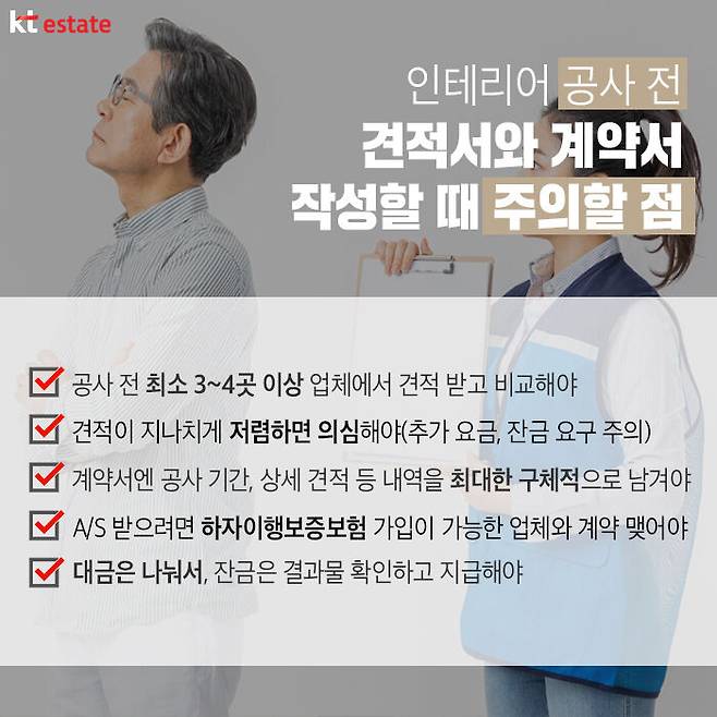 우선 인테리어 공사 전 최소 3~4곳 이상의 여러 업체에서 견적을 받아 꼼꼼히 비교해 합리적인 견적비용을 내야 합니다. 견적서에 기재된 총비용만 보지 말고, 세부 견적 금액도 꼼꼼하게 확인해야 추가 비용을 막을 수 있습니다. 또한, 다른 업체보다 견적이 지나치게 저렴하다면 일단 의심해볼 필요가 있습니다. 무조건 견적을 맞춰줄 수 있다는 식으로 얘기하다가 나중에는 추가 요금이나 잔금을 요구할 수도 있기 때문입니다.