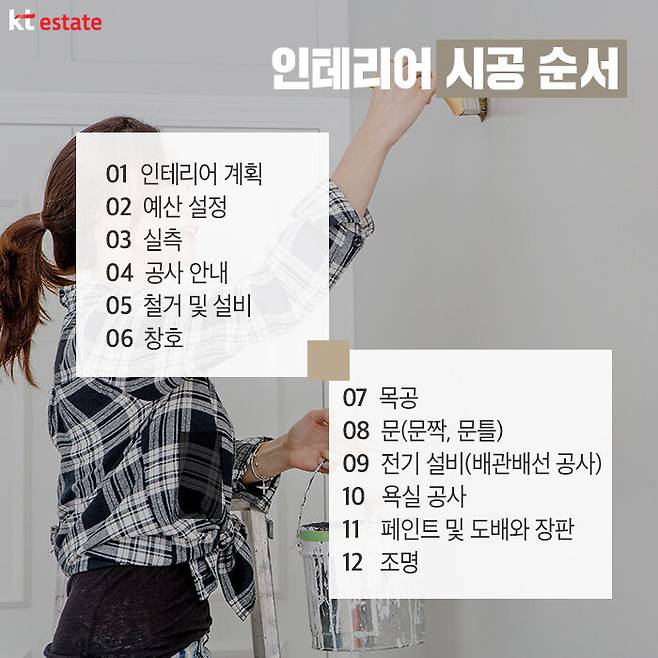 시공 프로세스는 대략 인테리어 계획 – 예산 설정 – 실측 – 공사 안내문 – 철거 – 설비 – 창호 – 목공 – 문 – 배선 – 욕실 – 페인트 – 도배, 장판 – 조명 순으로 이뤄집니다. 우선 인테리어 계획에서는 전체 인테리어 콘셉트를 어떻게 짤지, 시공 일정 등을 정하도록 합니다. 또한, 인테리어 범위와 예산을 초기에 정해 놓아야 차후 견적 작성 시 불필요한 비용 초과를 막을 수 있습니다.