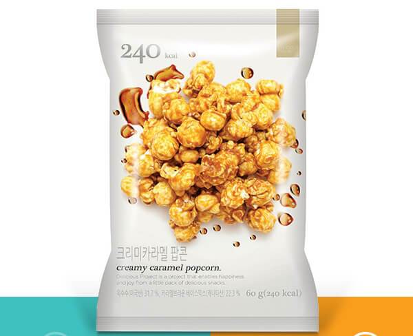 올리브영에서 판매 중인 D project 팝콘 시리즈는 크리미 카라멜 팝콘, 달콤한 초콜릿, 구운 옥수수 맛, 체다 치즈 볼까지 총 4가지 맛으로 일부러 적은 양을 담아 무심결에 많이 먹지 않도록 했다. 즉 건강을 위한 소 포장으로 1회 섭취량을 줄여 과도한 칼로리 섭취를 미연에 방지한 것. 각각의 특성을 살린 팝콘의 맛도 꽤 괜찮은 편이다. 특히 크리미 카라멜 팝콘은 브라운 카라멜 소스에 굴려 달콤하면서도 짭짤한 맛으로 인기가 많다.