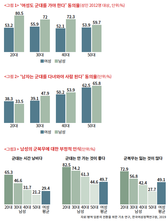 국방부는 사회적 합의를 기다려야 한다는 입장이다. 부승찬 국방부 대변인은 4월20일 병역제도 개편을 두고 “국민적 공감대 형성을 통한 사회적 합의를 종합적으로 고려해야 한다”라고 말했다. ‘합의’가 언제, 어떻게 이뤄질지는 불투명하다. 군에 대한 청년층과 중년층의 인식은 양극에 있고, 여성과 남성은 군복무가 개인에게 끼치는 영향을 정반대로 해석한다. 4년 전 청와대 수석들이 웃고 넘겨버린 이 갈등은 사실 우스운 이야기가 아니었다.