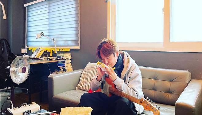 사진에는 정경호가 기타를 끌어안고 햄버거를 먹고있는 모습이 담겼다.
