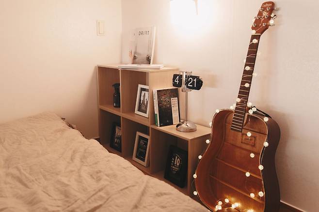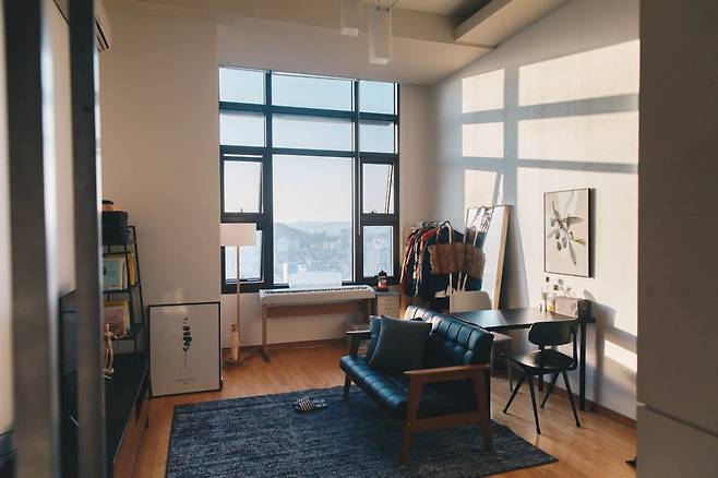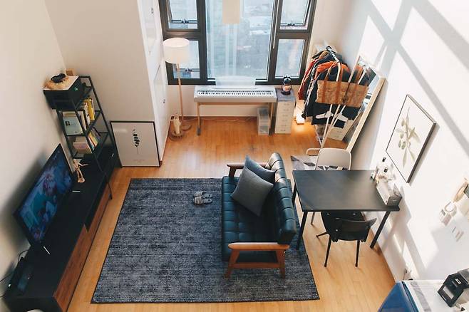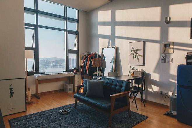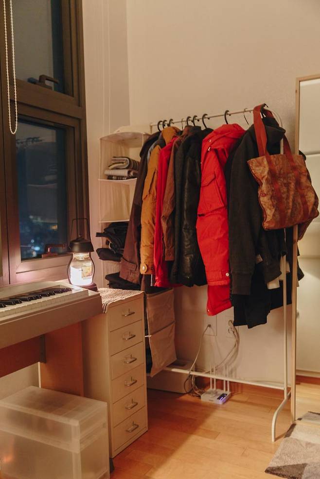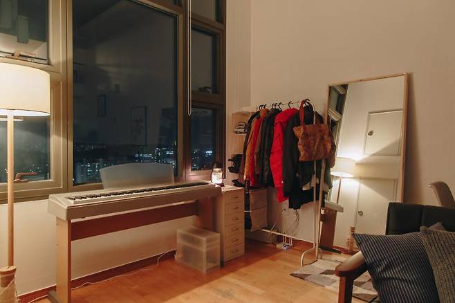 넓은 창 앞에는 피아노가 있어요. 취미로 피아노를 배웠는데 혼자 살면 심심할까 봐 본가에서 쓰던 피아노를 가져왔어요. 피아노 오른 편에는 행거와 전신거울을 배치했어요. 겨울엔 겉옷을.. 여름엔 자주 입는 티를 걸면 좋을 것 같다는 말씀과 함께..