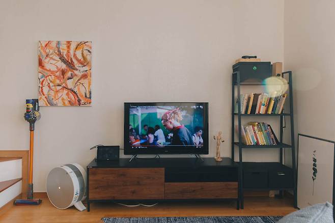 검은 소파와 잘 어울리는 검은색 러그와 TV 장 등.. 역시 집꾸미기란 생각을 했습니다. 저는 세상엔 흰 러그만 있는줄 알았어요. 러그를 두니 고양이가 안 미끄러져서 좋고 겨울엔 보일러 열을 잡아주는 것 같은 느낌도 들어서 마음에 듭니다.