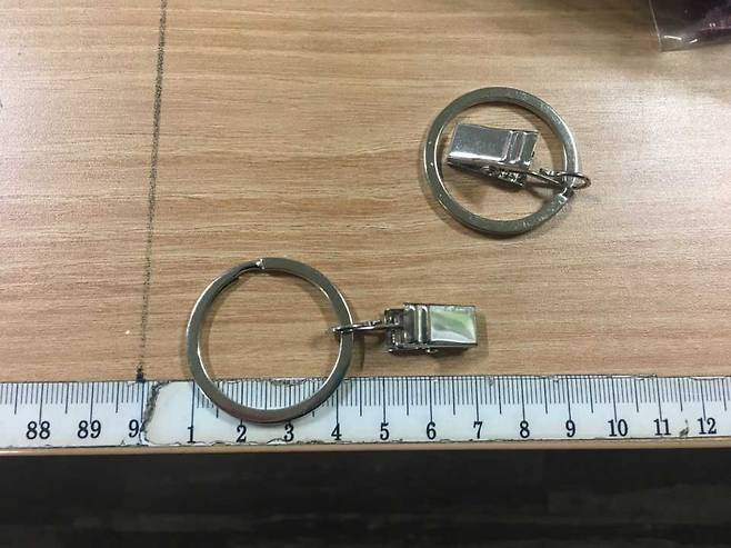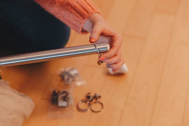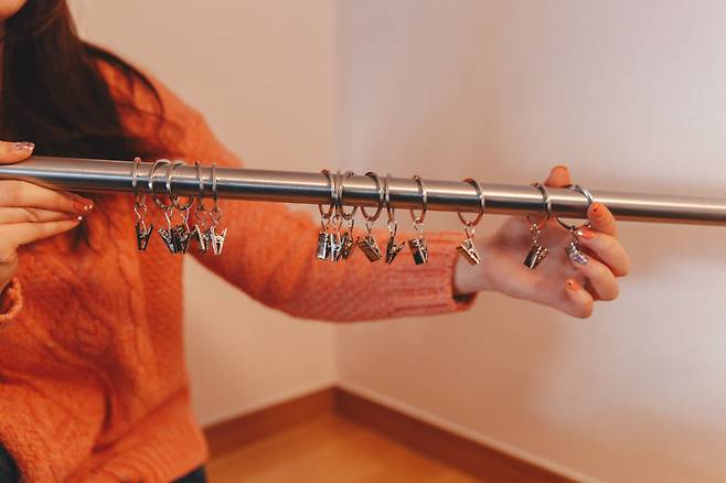준비물이 모두 준비되었다면 압축봉의 한쪽 마개를 빼주시고 커튼 집게고리를 압축봉에 하나씩 걸어주세요. 사용한 커튼 집게 고리의 직경(지름)은 약 45mm이고, 압축봉의 직경은 23mm라서 압축봉에 널널하게 끼울 수 있습니다.