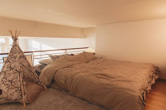 나머지 옷들은 1층 공간에 보관할 곳이 없어서 복층 침실에 보관했는데요, 복층 안 쓰는 자투리 공간에 옷장을 만들어주셨답니다.