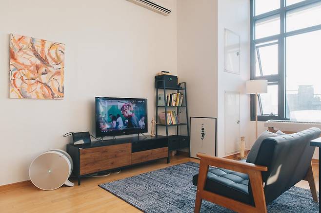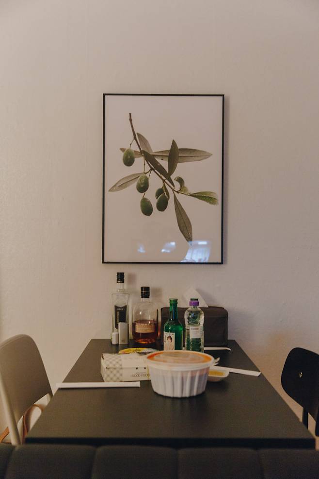 가끔씩 친구와 함께 영화 보거나 음악 틀어놓고 술 먹기 너무 좋아요! 층고가 높아 허전해 보이던 벽에는 액자를 걸어주셨는데요 스타일링 후 첫 밤에 퇴근 후 식탁 옆에 걸린 그림을 봤는데.. ‘아 내가 살고 있구나..‘ ’인간같이 살기 시작했구나..‘ 란 생각이 들었습니다. 정말이에요..ㅎㅎ
