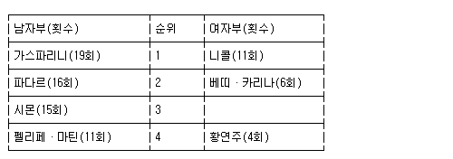프로배구 남녀 통산 트리플크라운 달성 순위(19일 현재)