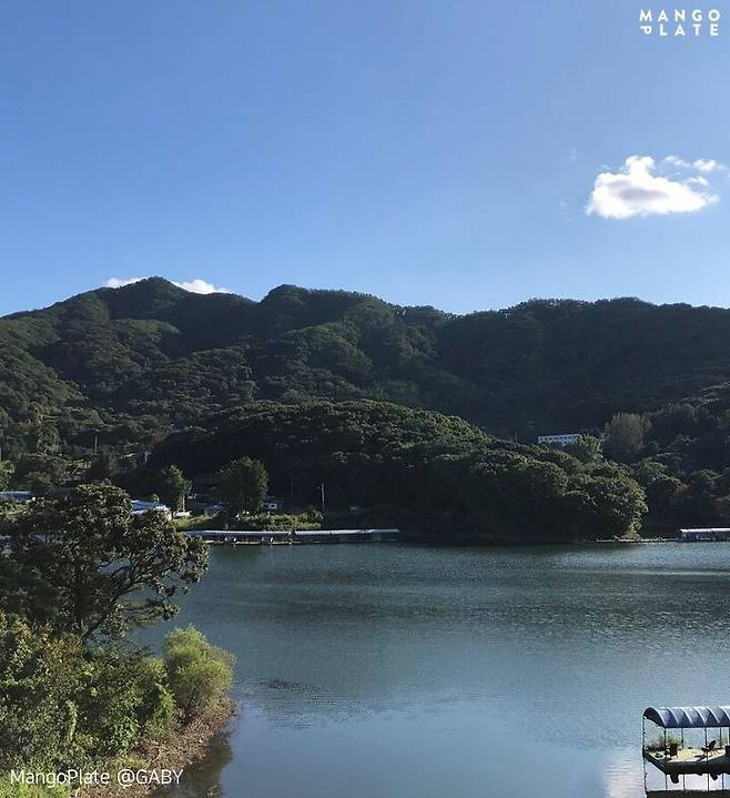 저수지지만 마치 강을 보는 듯한 시원한 뷰! 뒤에는 산이 둘러싸여 있어 맑은 공기를 쐴 수 있어요.